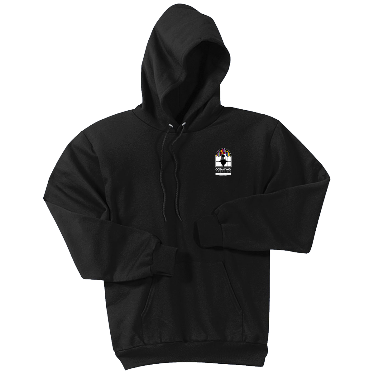 This Black 100% cotton unisex long-sleeve pullover hoodie features our "Ocean Way" microphone small Logo with a multi-colored stained glass design on the front left chest.