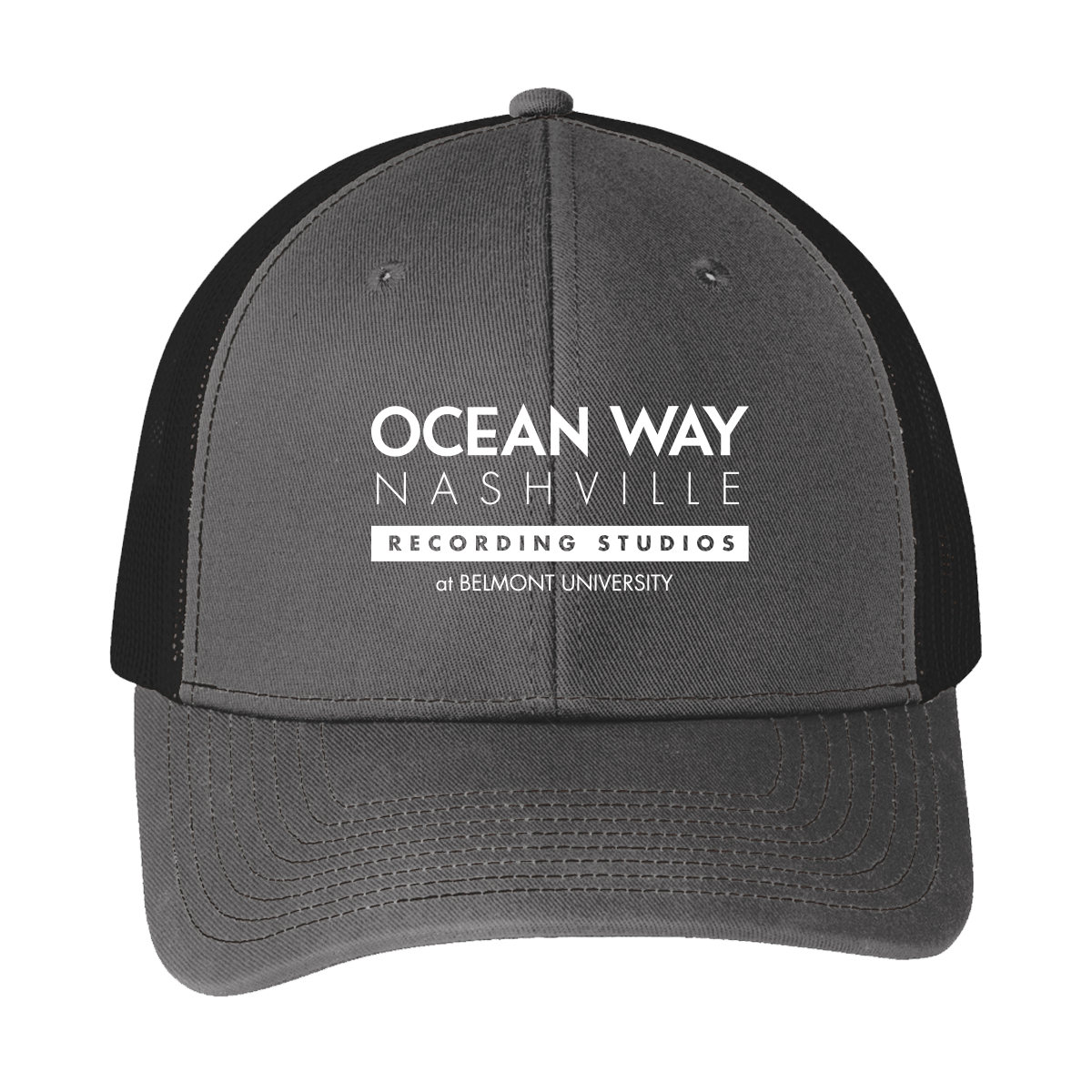 Black canvas front hat with "Ocean Way" logo screen printed on front. Adjustable back strap for one-size fits all.